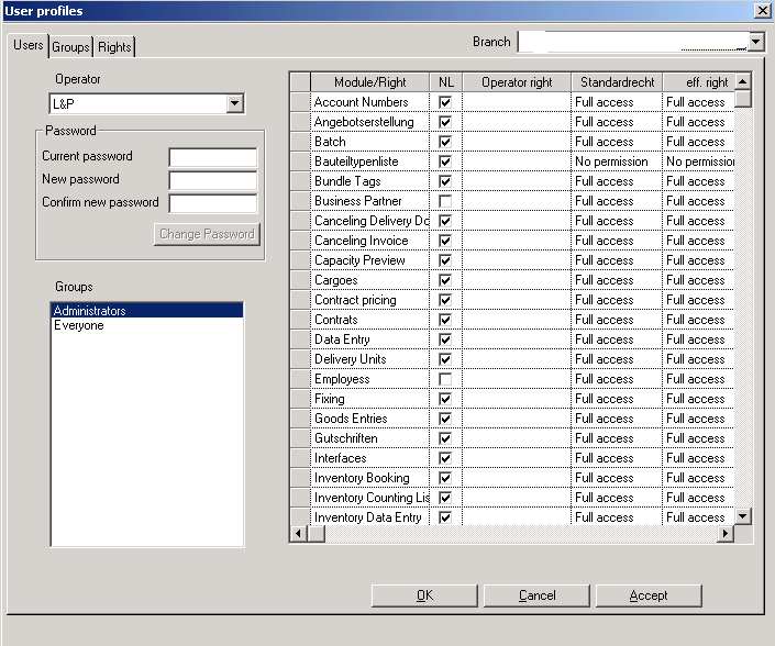 The user's account allows to give each user working rights for all essential progam functions in the system.